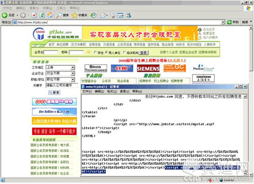 中国校园招聘网挂马事件(hxxp://www.91jobs.com/)被黑客植入病毒,用户如果访问该网站,系统就会自动从恶意网站上下载并运行恶意程序。被感染病毒的用户系统可能被远程控制,盗取用户敏感信息。甚至导致死机。