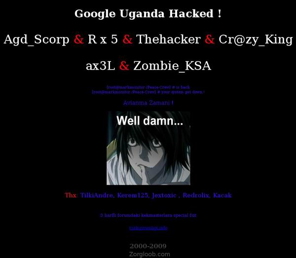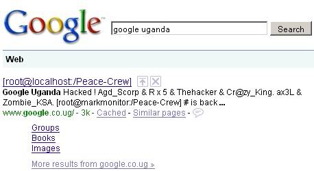 几个小时前,Google乌干达( google.co.ug )的主页被指向了一个黑客指定的页面,从页面信息来看,显然是和上次在波多黎各进行DNS劫持的是同一批人。
