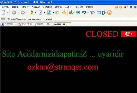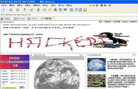 7月11日晚22时左右,不少网友在网上发帖称中国卫星气象中心网站被黑,并上传数张被黑的网站截图。有网友称,在11日下午该网站就已经受到黑客的攻击。有网友根据网站的国旗从而猜测黑客来自土耳其。根据网友所上传的截图可以看出,不仅中国卫星气象中心网站首页被黑,里面的各个子栏目:基本情况、风云卫星、科学研究、空间天气等及很多二级子栏目也都被黑。有的整个页面只有长长的英文;有的内容被换成乱七八糟的文字,各字还链接着各式各样的网址。
