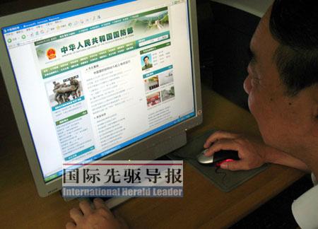 一名上海市民正在浏览中华人民共和国国防部网站。本报记者 张波/摄