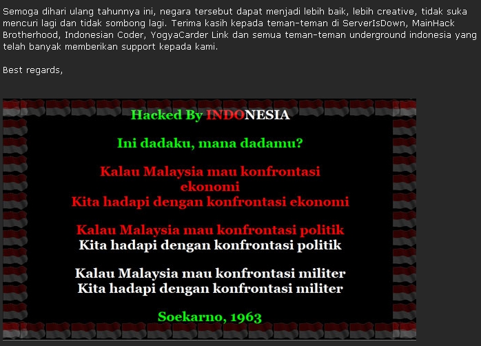 F-Secure 发现一群署名“印度尼西亚编码人员” (INDONESIAN CODER)的网上不法份子在周一向多个马来西亚网站发动恶意攻击,令运作陷入停顿。有报道指两国过去曾因文化、非法劳工及领土间题出现多次冲突,这次事件不排除激进份子趁邻国国庆节以互联网袭击泄忿。