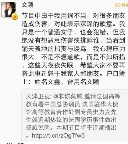 李开复今日表示,文颐已经在微博中道歉,并附上道歉全文。文颐称,节目中我用词不当,对很多朋友造成伤害,对此表示深深的歉意。她强调,绝不是恶意伤害或者挑衅谁,并称自己心理压力很大。