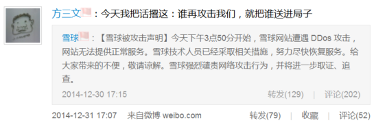 雪球财经在声明中强烈谴责网络攻击行为,并称将进一步取证、追查。雪球财经创始人方三文放言:“谁再攻击我们,就把谁送进局子。”