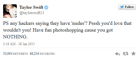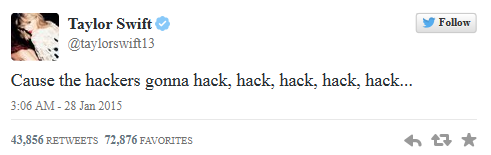 据外媒报道,当地时间1月27日下午,歌手Taylor Swift的Twitter账号被自称为黑客组织Lizard Squad“首领”的人给黑掉。Swift为Twitter上拥有粉丝数量第四多的用户,这也意味着该平台遭遇了有史以来影响范围最大的一次攻击。据悉,黑客在Swift账号上发布的消息大约在15分钟后被删除,应该是Swift团队或Twitter发现异常并恢复了账号。