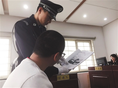 法警为被告人王某出示证据。昨日上午,被控涉嫌破坏计算机信息系统罪的王某在法院受审。新京报记者 刘洋 摄
