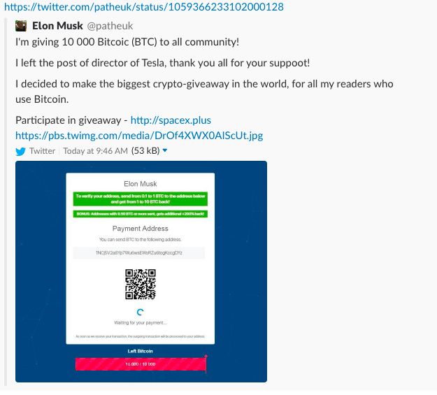 为了骗取受害者的加密货币,黑客承诺将任何向他们的钱包发送少量比特币的人投资翻倍。黑客还更新了Pathé的帐户,冒充Elon Musk,或许是为了给假冒赠品增加可信度。目前看来Pathé已经能够收回其帐户并删除诈骗推文。它还更新了其头像和显示名称,以删除Elon Musk相关的诈骗行为。在删除这些诈骗推文之前,推文已经有超过850转推和3700个喜欢。