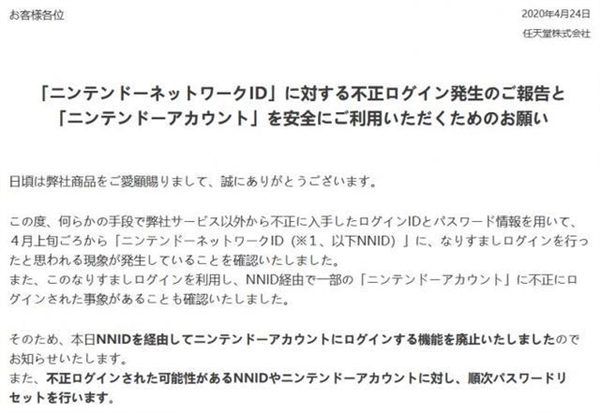 任天堂表示,自 4 月初以来,“通过我们的服务以外的其他一些手段非法获得的登录ID和密码已经被用于访问这些账户。”