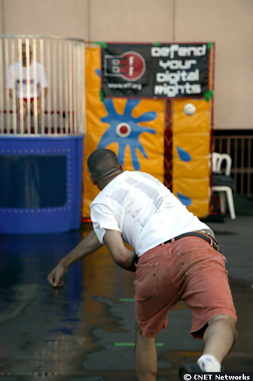 这位名为Michele的辣妹也自愿上来“落水”,全力支持电子前线基金会的募款活动。与会者若无法从25英尺外(约8公尺) 的地方击中目标,即可选择付费25美元,然后走到水箱前按下拉杆让辣妹落水。这招吸引不少人掏口袋。