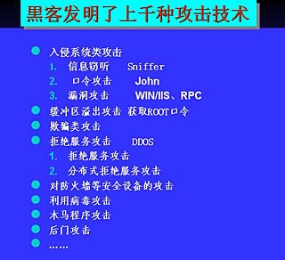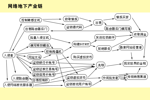 “现在互联网上赚黑钱的门道实在太多了。有的人通过入侵网络游戏服务器来盗取虚拟货币、游戏用户账号,再卖给中间商,中间商通过销售渠道转手也能赚上一笔。有的人通过盗窃银行卡账号、证券交易账号、信用卡账号洗钱。有的通过控制敏感主机来窃取信息,再将这些信息出售;有的入侵路由器,而后向人出售控制权;还有的通过控制傀儡机、批量入侵主机等方式,向一些网站发起拒绝服务攻击,而后勒索网站经营者。