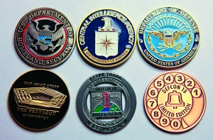 它们是象征着黑客大会会员资格的限量版徽章,不同的徽章代表参加者不同的身份和来源组织。黑客、政府安全顾问及军事专家经常互赠硬币,以表达欣赏对方才华之情。从左到右分别代表:美国国土安全部(DHS)、美国中央情报局(CIA)、美国国防部(DOD),以及黑客组织“黑客大会”(DefCon)和 “忍者网络”(Ninja Networks)。