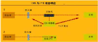 传统的IDS只能在旁路上通过探测经过交换端口的数据包,以被动方式监控数据流量;而IPS则能够实时阻断攻击,它不是旁路安装而是在线安装,因此能主动截获并转发数据包。借助于在线方式,IPS可根据设定的策略丢弃数据包或拒绝连接。传统IDS的响应机制非常有限,比如只能做到对TCP连接复位或者请求更改防火墙规则等。