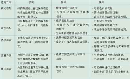 为了避免这种结果,IDS和IPS厂商现正在运用多种检测方法,尽量提高产品发现已知和未知攻击的准确性(如表所示)。比如,赛门铁克从Recourse公司收购来的ManHunt IDS最初曾完全依赖协议异常,而在后几个版本中,则允许管理员导入Snort特征,以便增强异常检测功能。思科最近也升级了IDS软件,为基于特征的检测系统增添了协议和流量异常检测功能。NetScreen的设备中声称拥有八种检测方法,其中包括状态特征、协议和流量异常以及后门检测。