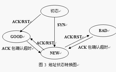 2) 监听到ACK或RST包,如果源地址的状态为NEW状态,则转为GOOD状态;如果是GOOD状态则不变;如果是BAD状态则转为NEW状态;如果是BAD状态则转为NEW状态。