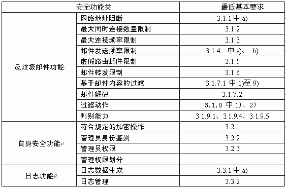 依据反垃圾邮件产品的开发、生产现状及实际应用情况,该类产品安全功能的最低基本要求见表1
